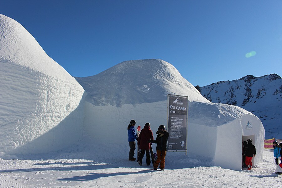 Located 2600m above sea level, Ice Camp 2020 comprises three uniquely-designed igloos, each 12m in diameter and 6m high. The centrepiece is the unique Ice Symphonium, created by Austrian artist Max Seibald. Made completely from ice, this impressive instrument is essentially a kind of ‘singing bowl’ with giant, stylized horns. Visitors can use touch pads to change the sounds which, as the artist says, “evoke an atmosphere of sublime harmony in combination with gentle ‘music of the spheres’”.