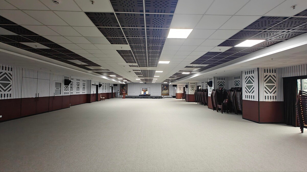 Designing such a hall comes with distinct challenges. These spaces are neither typical auditoriums nor standard conference rooms; their acoustic needs are uniquely complex. Without proper treatment, reflections and reverberation can easily distort speech, especially during large gatherings. The challenge was to deliver an acoustically refined space that maintained a clean visual aesthetic while ensuring high intelligibility and uniform sound distribution for every listener.